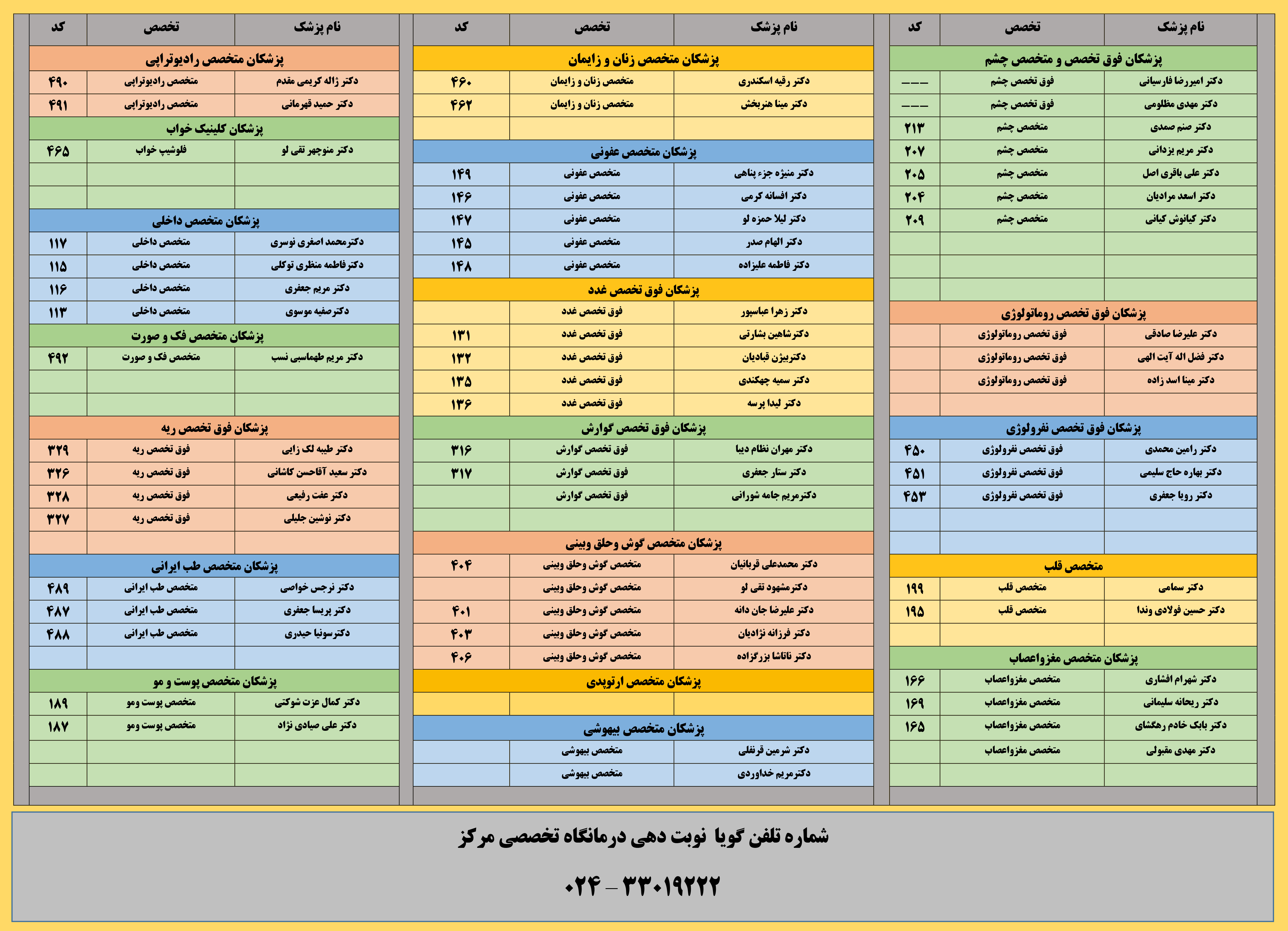 (جدول پزشکان متخصص و فوق تخصص مرکز و کد۳ رقمی جهت دریافت نوبت دهی درمانگاه)