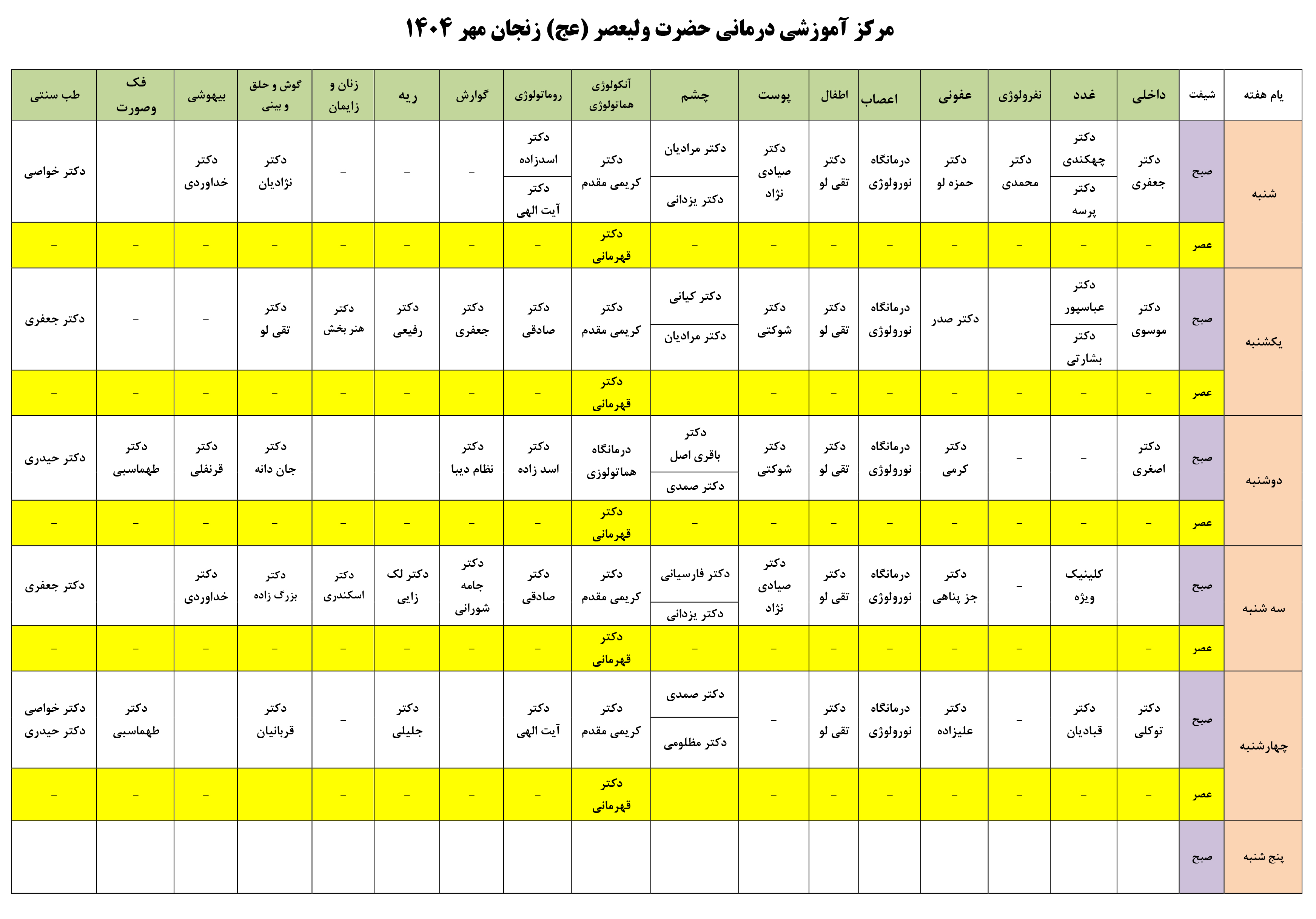 برنامه هفتگی درمانگاه تخصصی و فوق تخصصی مرکز آموزشی درمانی حضرت ولیعصر (عج)