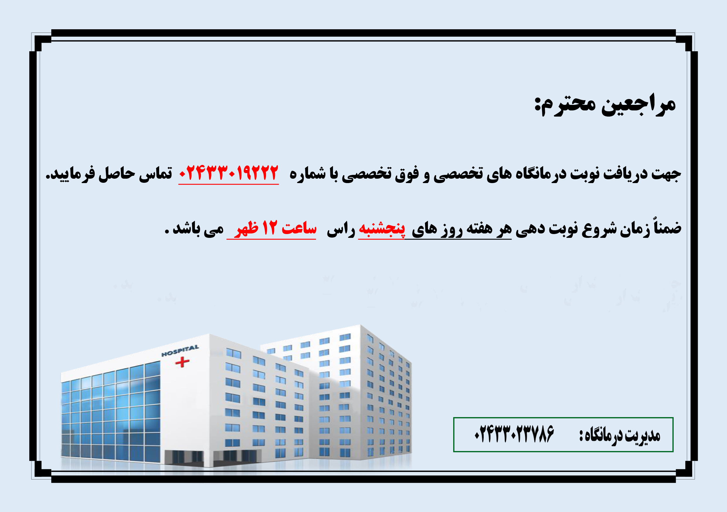 آدرس:زنجان - بالاتر از میدان ولیعصر _ بلوار دکتر شریعتی _ مرکز آموزشی و درمانی حضرت ولیعصر(عج)